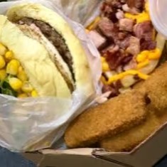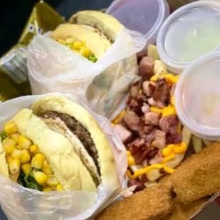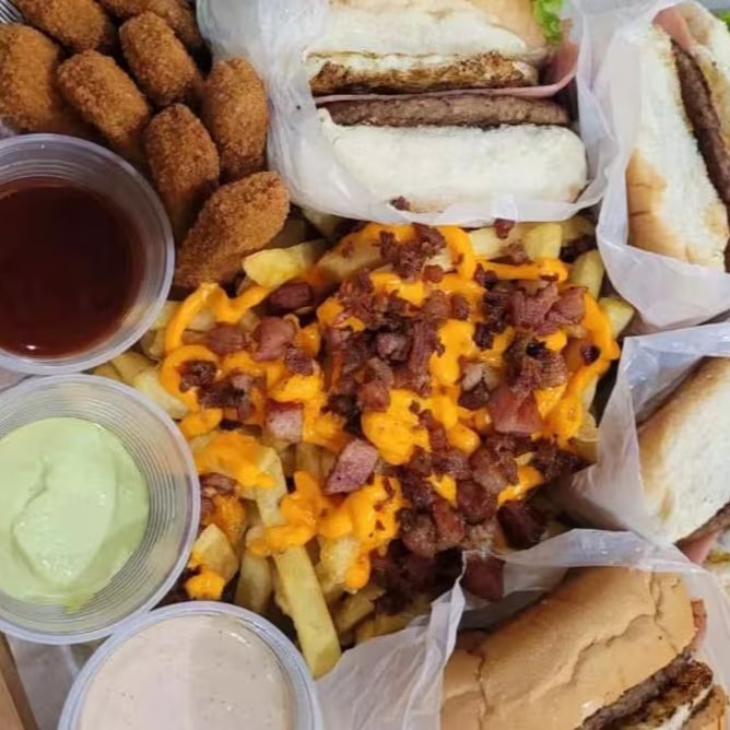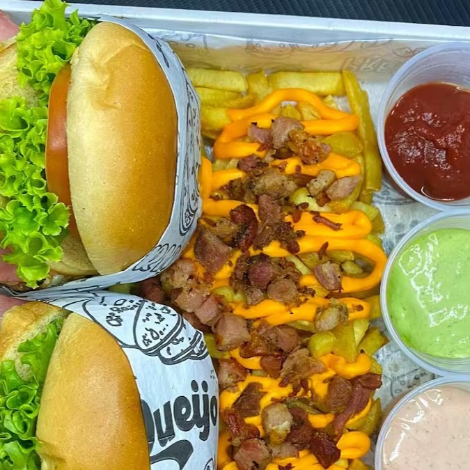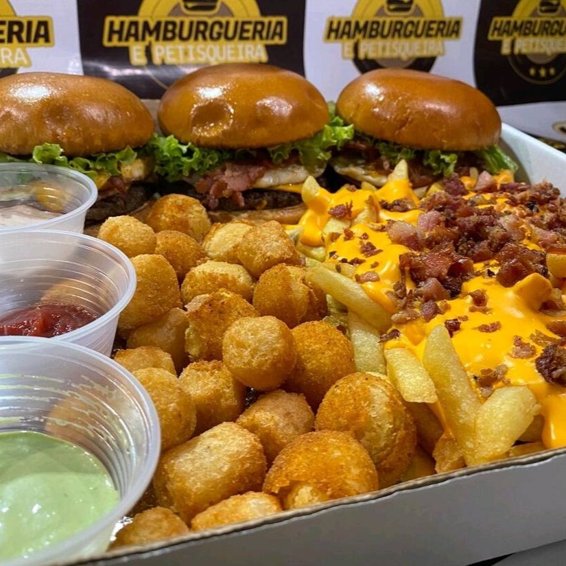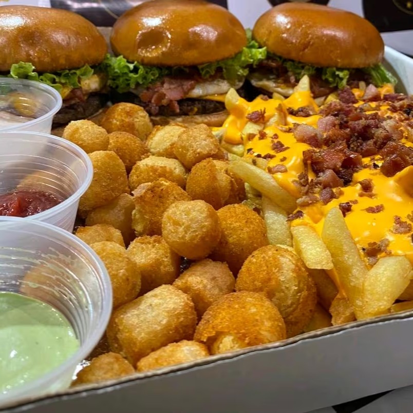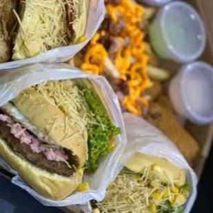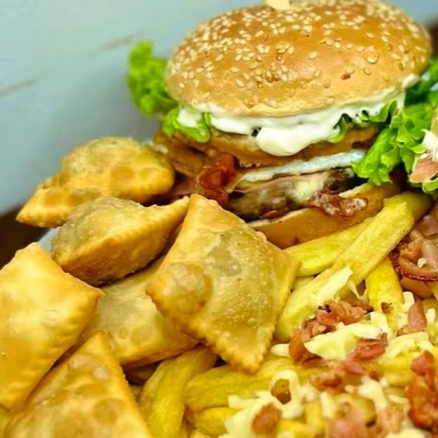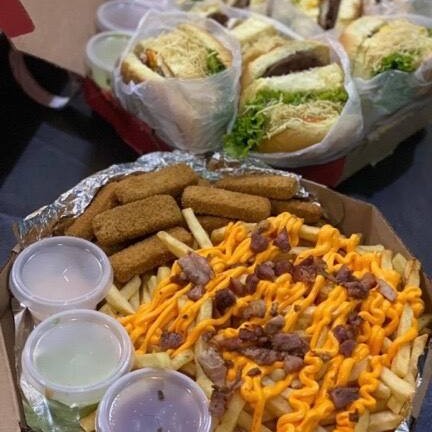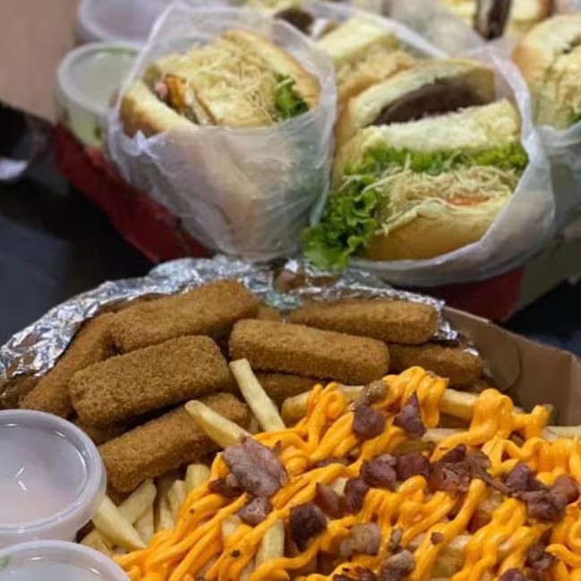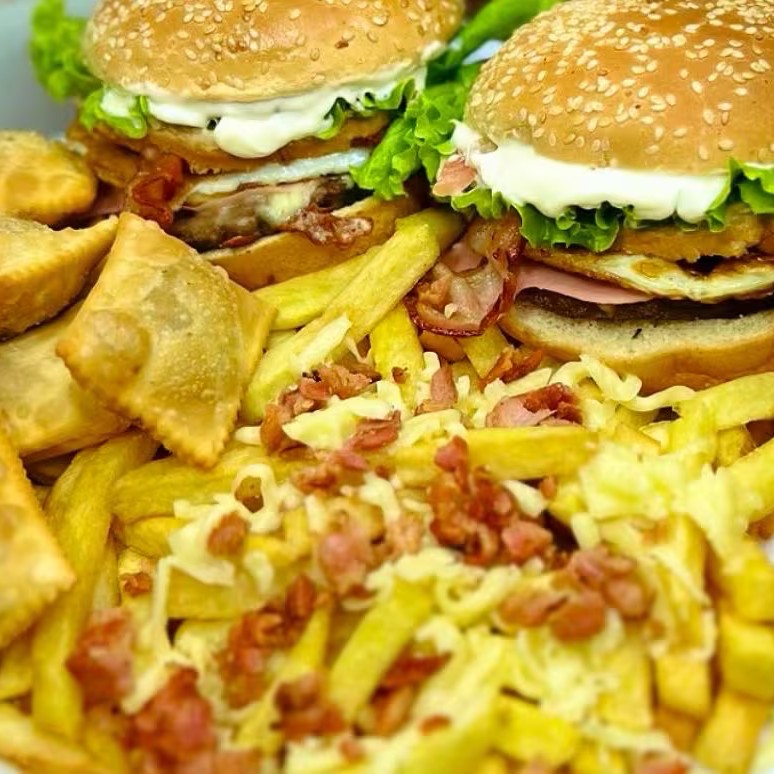 3 sanduiches especiais, pão de hambúrguer especial, carne de hambúrguer tradicional, muçarela, presunto, ovo, bacon, salada e maionese grill+ fritas com muçarela e bacon + 12 pastelzinhos.