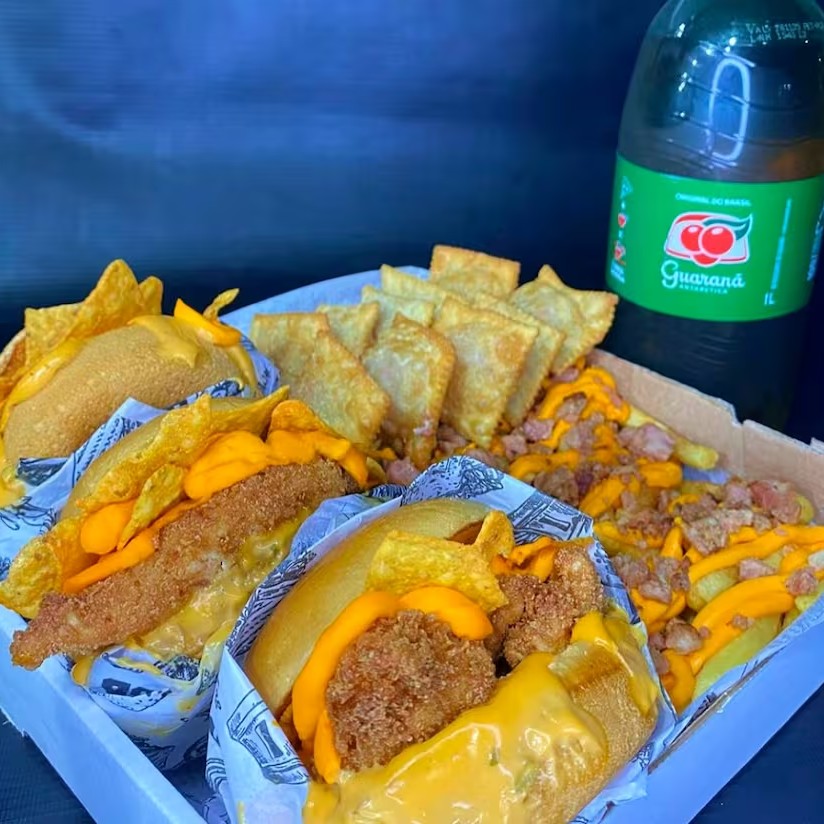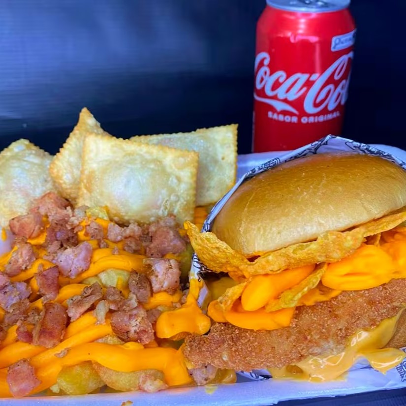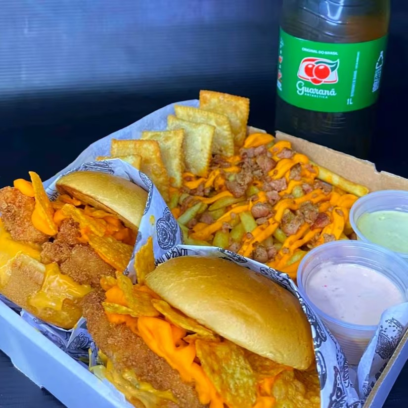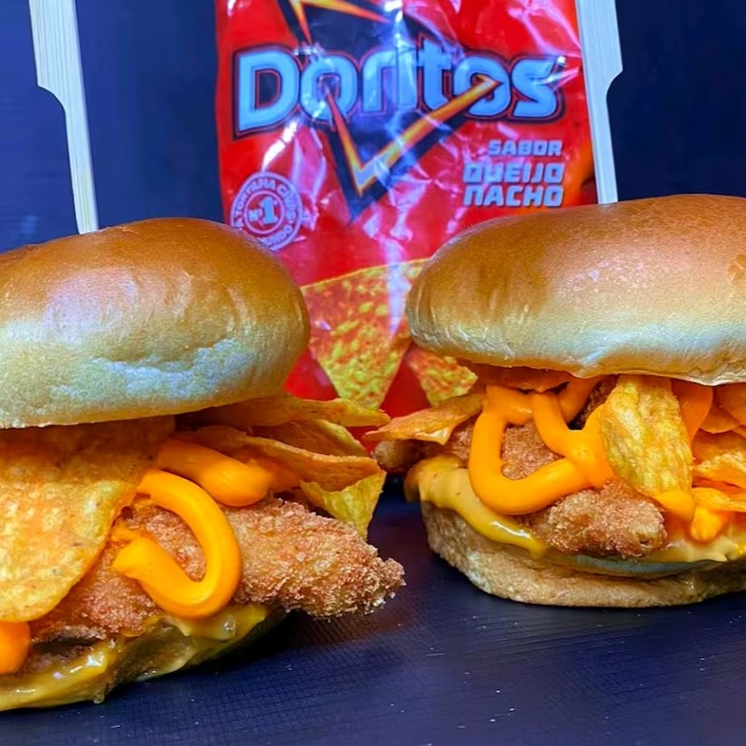 2 doritos chicken: pão de brioche, 140g de file de frango empanado, doritos, queijo cheddar, molho americano + porção de fritas com cheddar e bacon + 8 pasteizinhos.