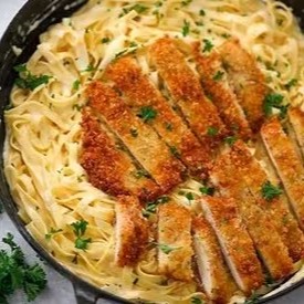 Espaguete cozido ao dente: bacon, milho, tomate, cebola, calabresa, molho inglês, molho de alho, ovo, muçarela + file de frango empanado.