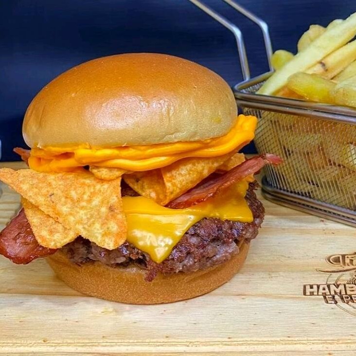 Pão brioche, carne artesanal 160g, bacon em tiras, queijo cheddar, doritos, molho chiplote, acompanha fritas.