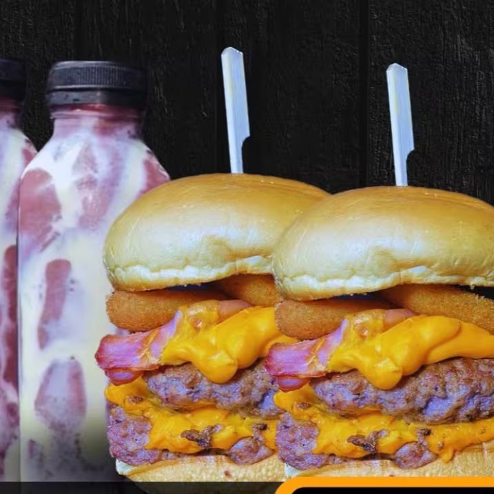 4x bacon: pão de brioche, carne de 90g muçarela, presunto, ovo, bacon + fritas com cheddar e bacacon+ nuggets acompanha nossos molhos especiais ah ainda acompanha um refrigerante 2 litros geladinho. Serve 4 pessoas.