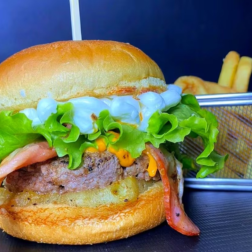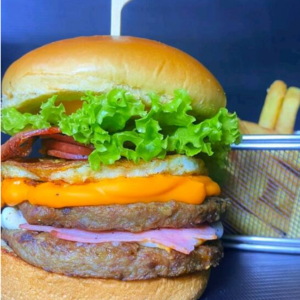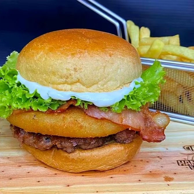 Pão de brioche, carne tradicional de 90g, presunto, ovo, bacon em tiras, maionese defumada, salada. Acompanha batata fritas.