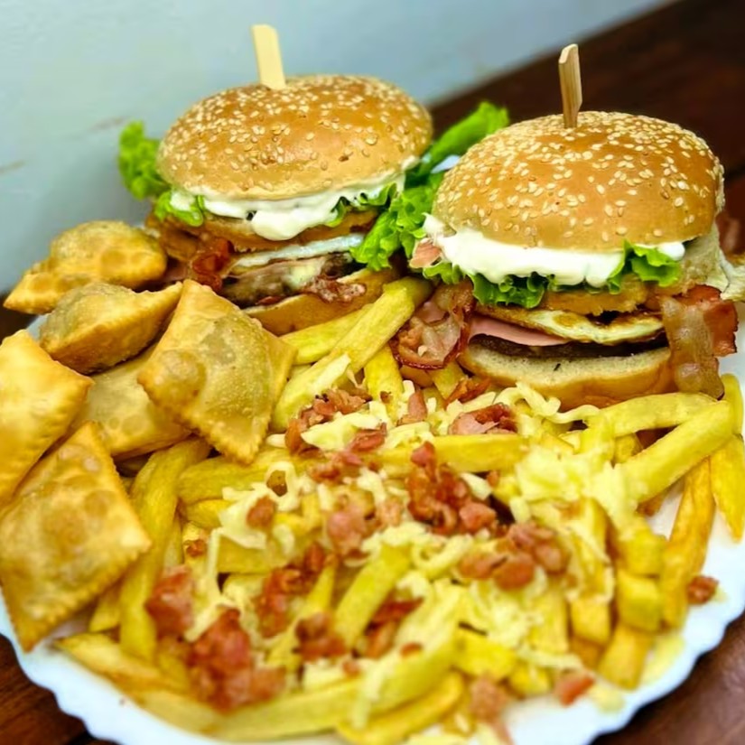 2 sanduiches completos, pão com gergelim, carne tradicional, muçarela, presunto, ovo, salada, maionese especial. Acompanha frita com muçarela e bacon + porção de pasteizinhos. Serve 2 pessoas.
