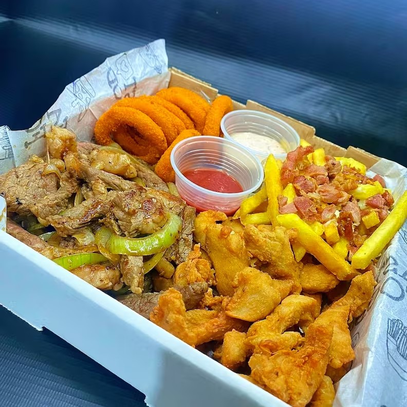 350g de contra file acebolado, 400g de file de frango empanado, 300g de fritas com muçarela e bacon.