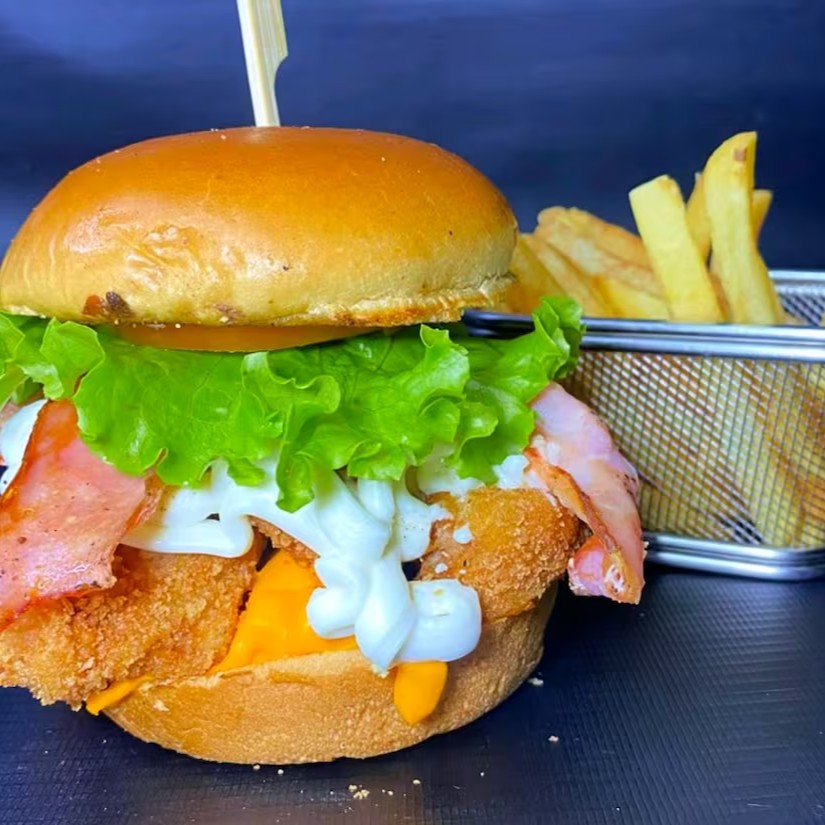 Pão de brioche, 150g de filé de frango empanado, bacon, queijo cheddar, molho ranch, salada.