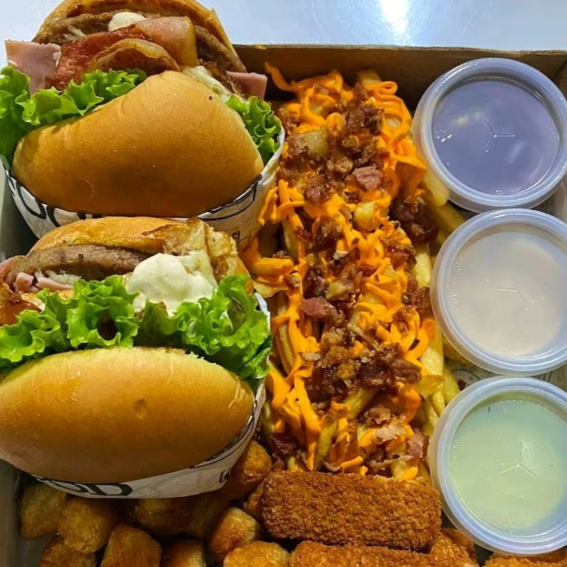2 hambúrguer: pão de hamburguer, muçarela, presunto, ovo, salada, molho especial. Acompanha porção de fritas, nuggets e pastelzinho.