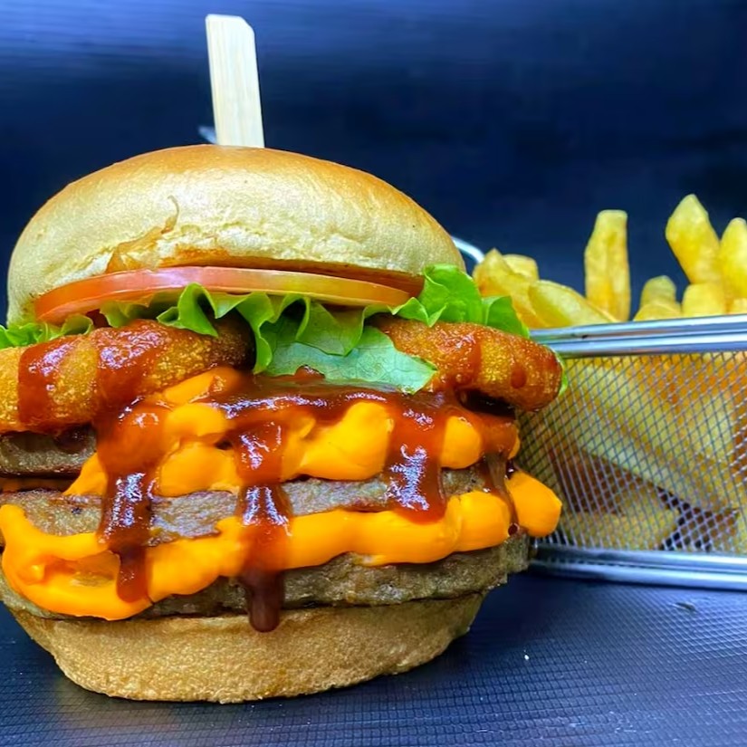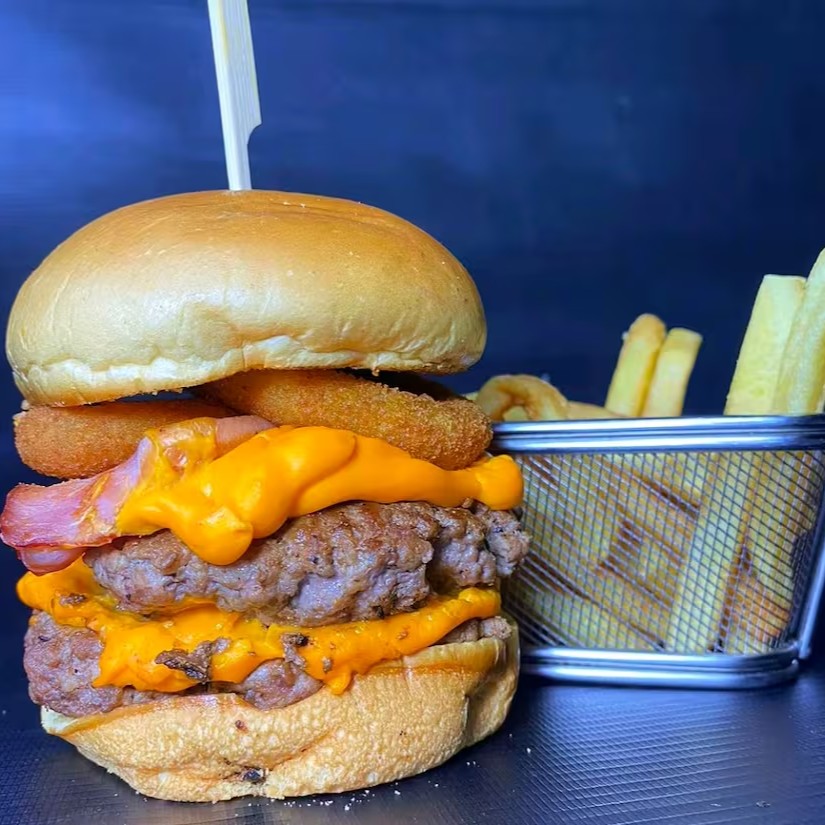 Pão brioche, 3 carne 90g, 3 fatias de queijo cheddar, bacon, 3 cebola empanada, molho barbecue, salada. Acompanha fritas.