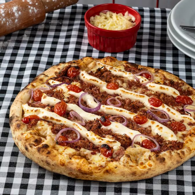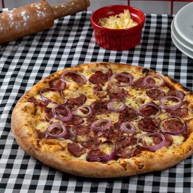 Massa de Fermentação Lenta, Muito Molho de Tomate, Calabresa Fatiada, Muçarela e cebola roxa