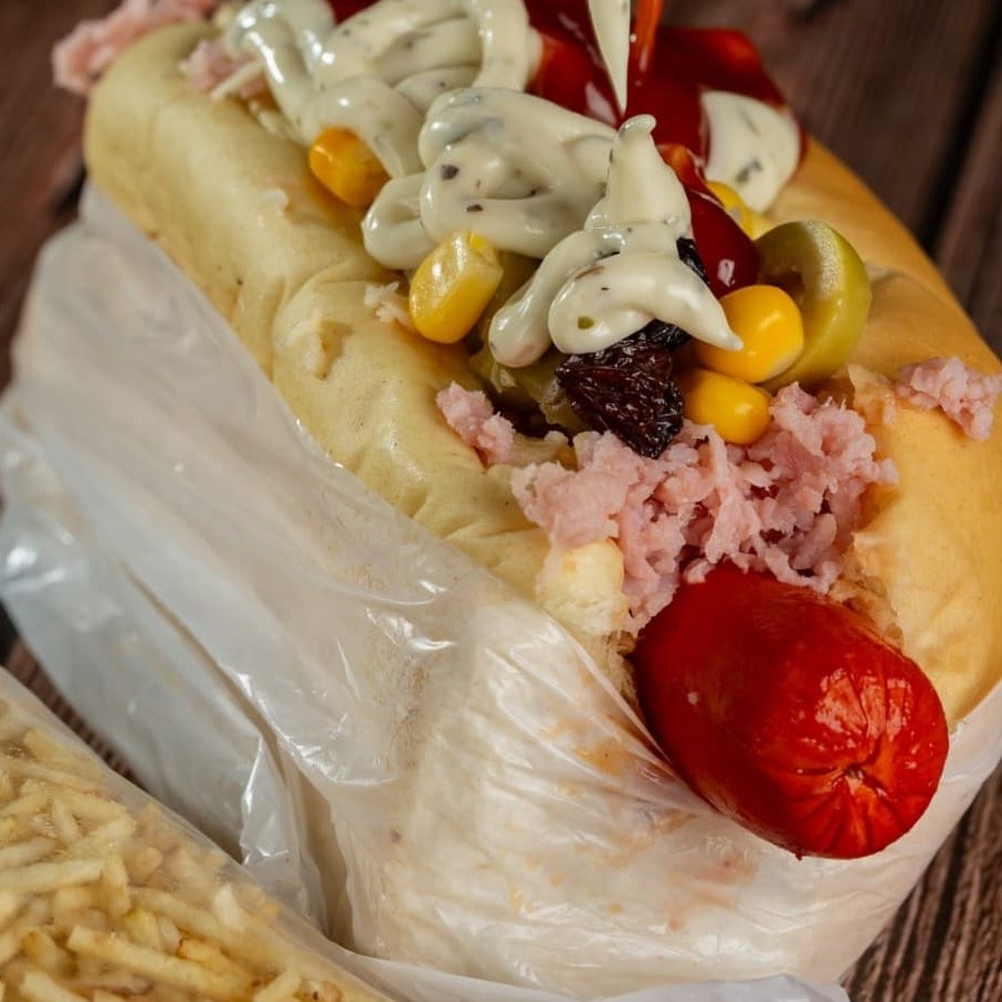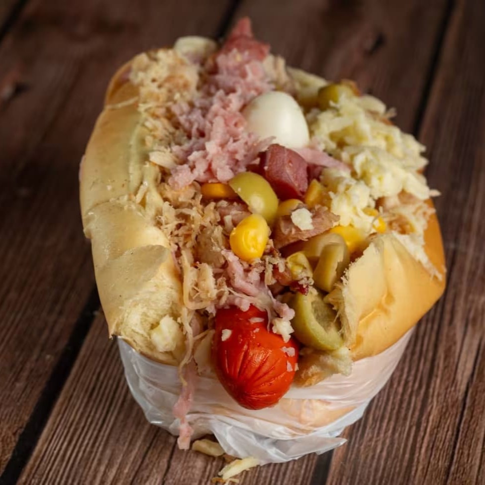 Pão, molho, 2 salsichas, presunto, mussarela, milho, ovo de codorna, cheddar , azeitona, passas, Catupiry, frango desfiado, bacon e batata palha.