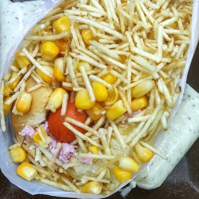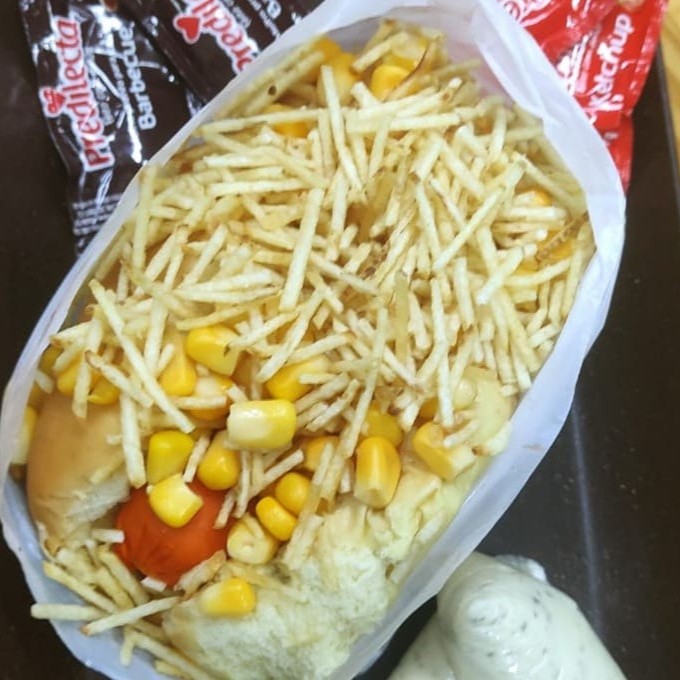 Pão, molho, salsicha, presunto, mussarela, milho e batata palha.