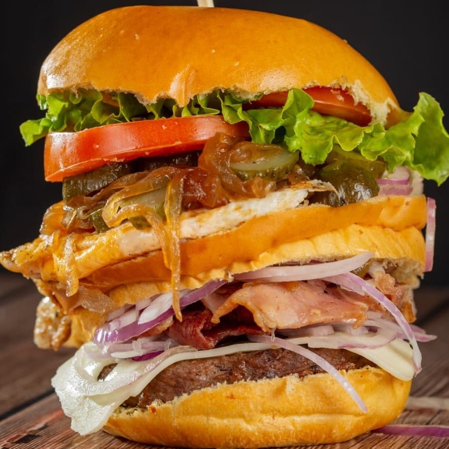 Pão, 1 hambúrgueres artesanais 120g, bacon, presunto, ovo, cheddar, cebola roxa, picles, alface e tomate. Uma experiência insana de sabores e texturas.