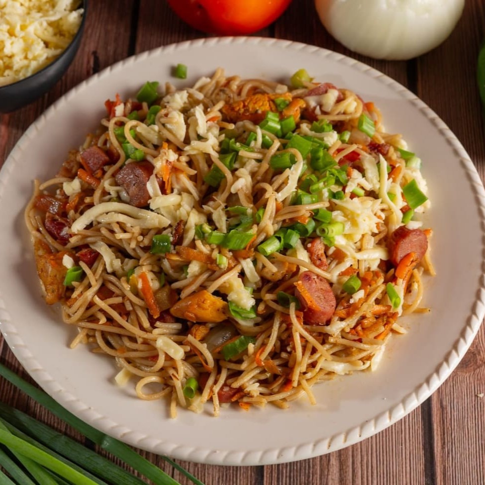 Macarrão na chapa Grande , File de peito de frango, calabresa, bacon, milho, azeitona, cenoura ,vinagrete,molho especial mussarela e cebolinha .Um prato suculento e irresistivel .
