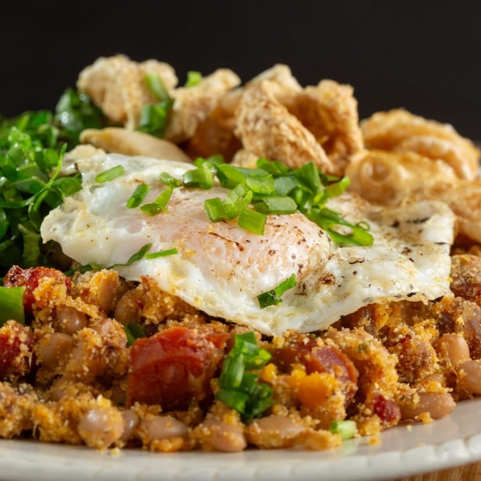 Feijão, carne de pernil, calabresa, bacon, couve, torresmo, cebolinha e ovo. Uma deliciosa combinação de sabores tradicionais.