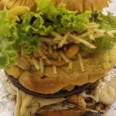 Pão , hamburguer artesanal de 120 gr , bacon , ovo , mussarela, presunto , cheddar, alface, tomate, milho, batata, frango desfiado e picles .