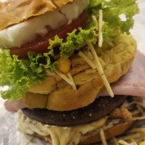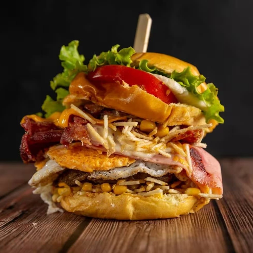 Pão, hambúrguer de picanha 56 gr, bacon, presunto, ovo, mussarela, cheddar, alface, milho batata e tomate. Tudo que você ama em um só lanche.