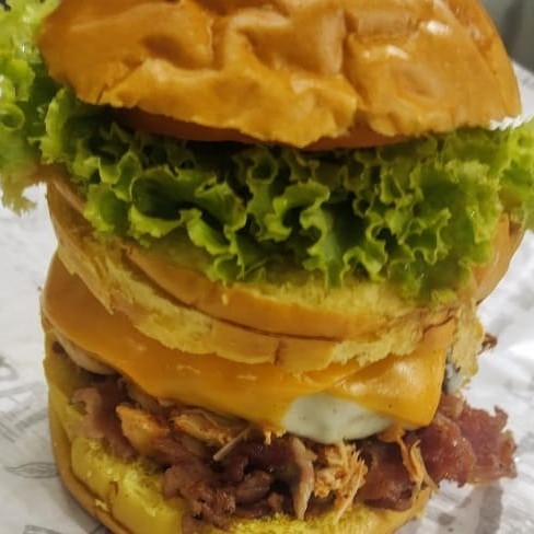 Pão, hambúrguer artesanal 120g, bacon, mussarela, ovo, alface, tomate, milho e batata. Bacon crocante e ovo suculento em um só lanche.