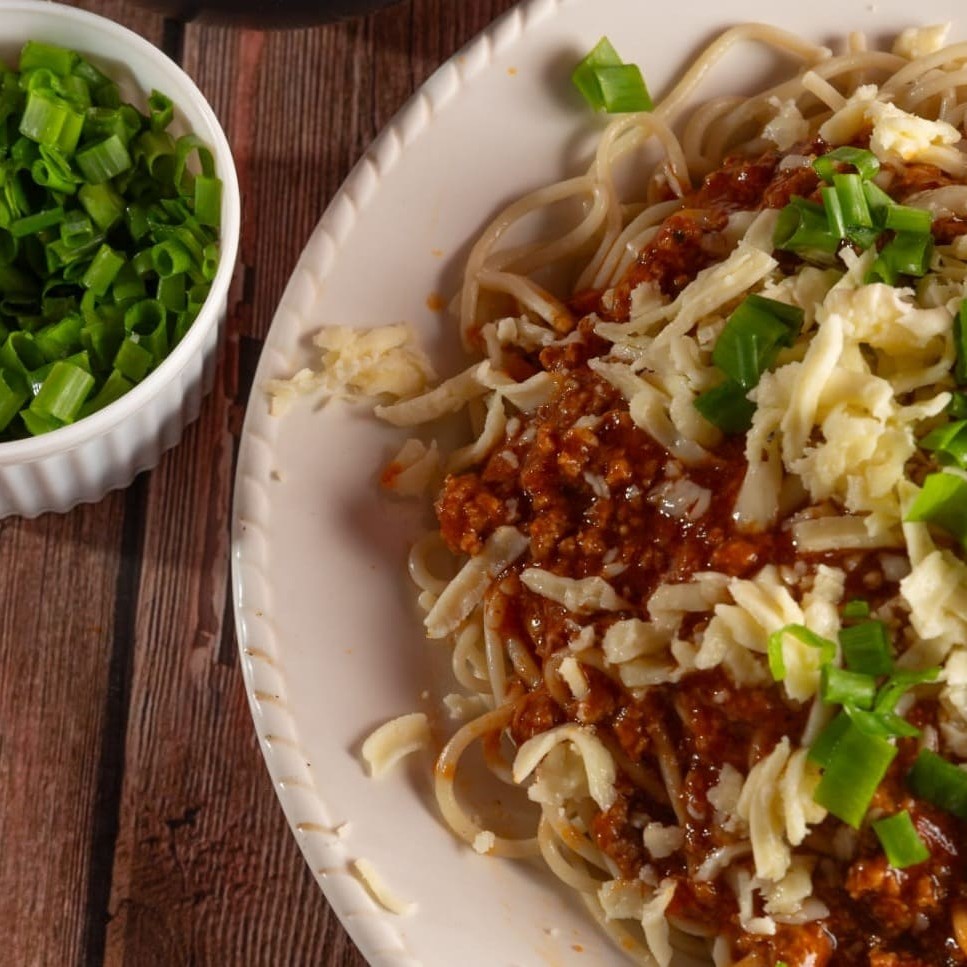 Molho bolonhesa com bacon, mussarela e cebolinha. Uma explosão de sabores em cada garfada.