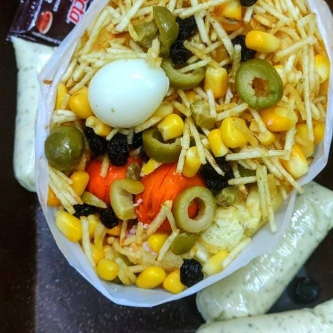 Pão, molho, 2 salsichas, presunto, mussarela, milho, ovo de codorna, passas, azeitona e batata palha.
