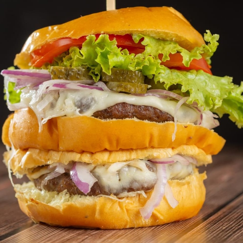 Pão, 2 hambúrgueres artesanais 120g, mussarela, cebola roxa, picles, alface e tomate. Um lanche especial com o dobro de sabor e ingredientes frescos.