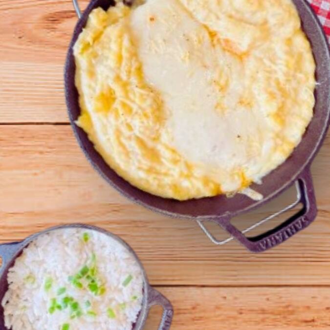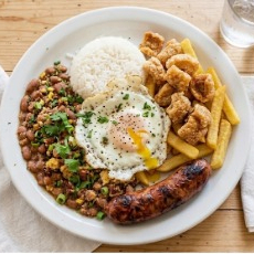 Delicioso feijão tropeiro acompanhado de arroz, couve, ovo frito, torresmo e bife de lombo. Serve duas pessoas