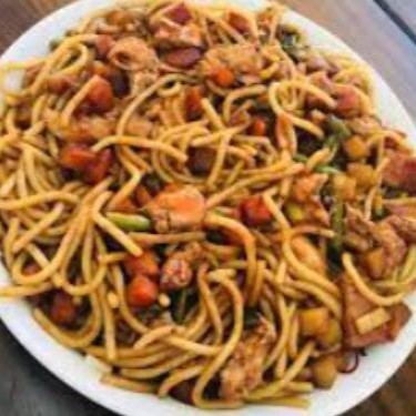 Macarrão feito na chapa, o legítimo. Repolho roxo, verde, pimentão verde, vermelho, amarelo, frango desfiado bacon, calabresa, Shoyo, tomate, Prato grande para uma pessoa.