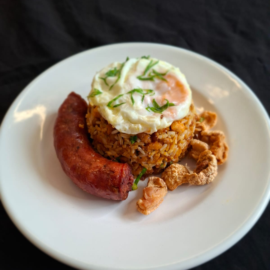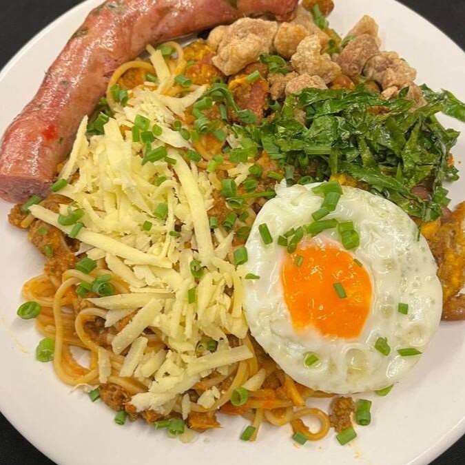 Feijão tropeiro, espaguete a bolonhesa, ovo frito, torresmo, couve e linguiça