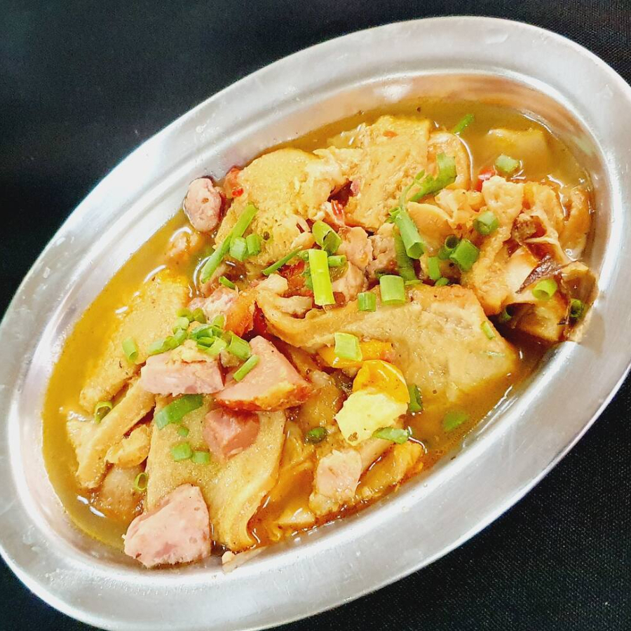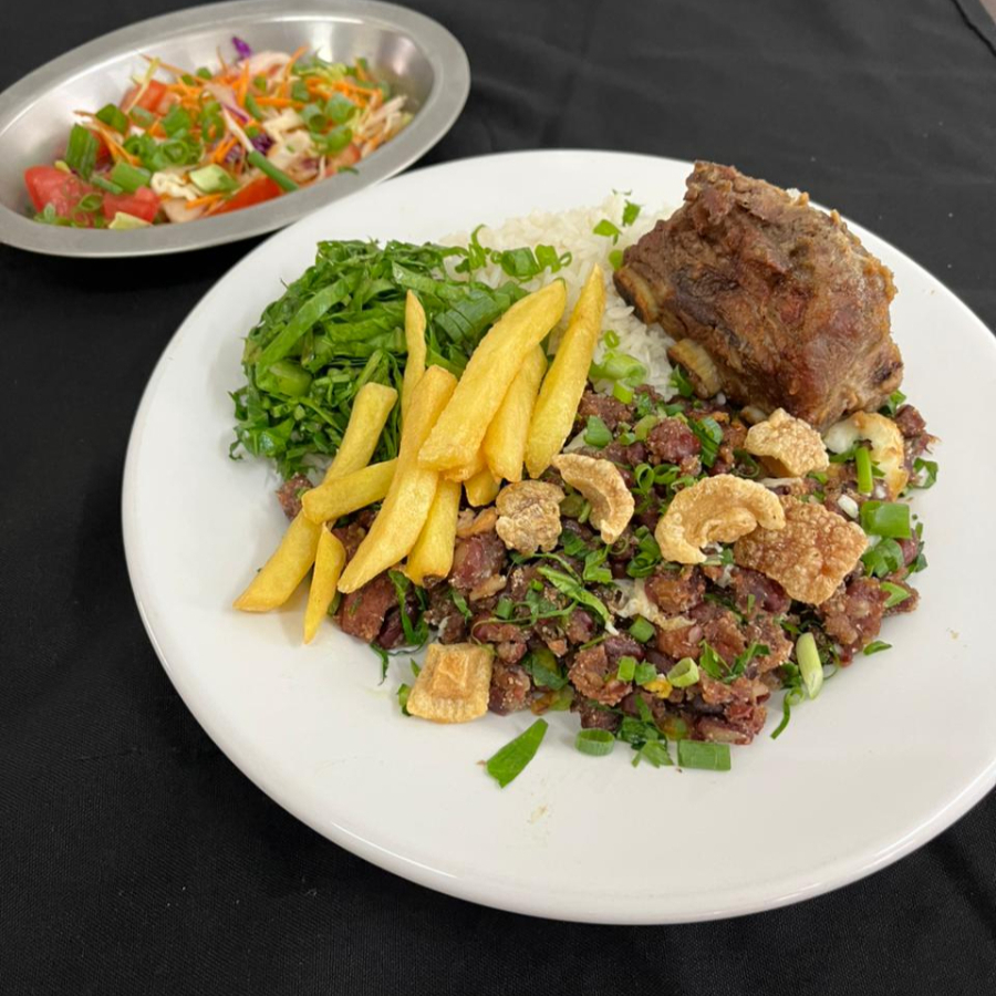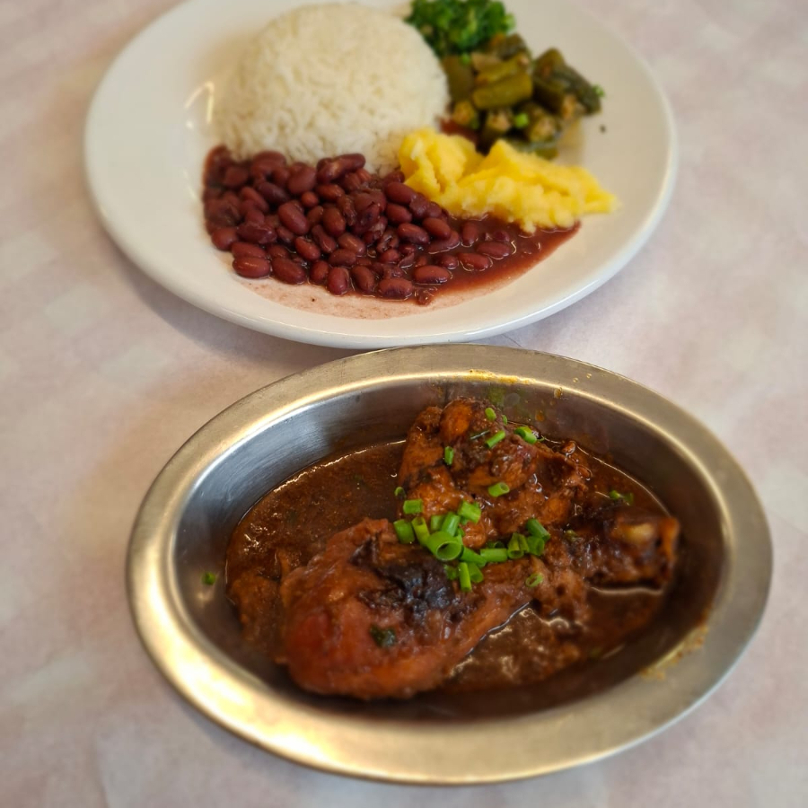Frango ao molho pardo, arroz, feijão, angu, couve e quiabo