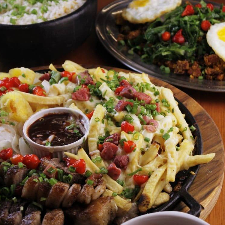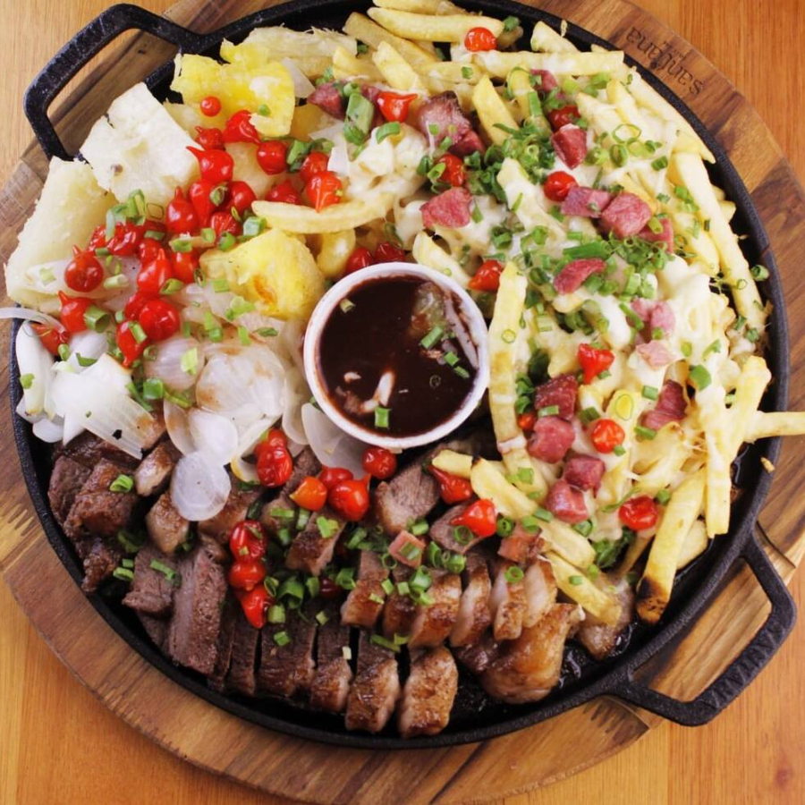 400g de picanha argentina feita na brasa, acompanhada de 400g de fritas c/ mussarela e bacon, 400g de mandioca na manteiga e cebola assada e finalizada com cheiro verde e pimenta biquinho.