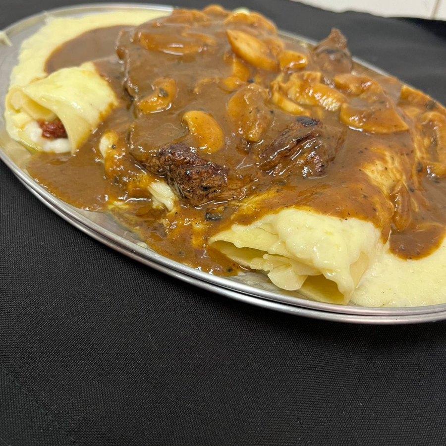 Canelone recheado com palmito e tomate seco e requeijão ao molho branco, acompanhado de filé mignon ao molho madeira.