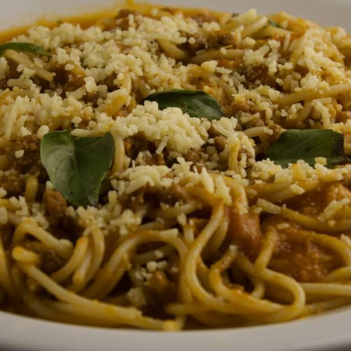 Tradicional espaguete ao molho à bolonhesa finalizado com queijo parmesão e cebolinha.