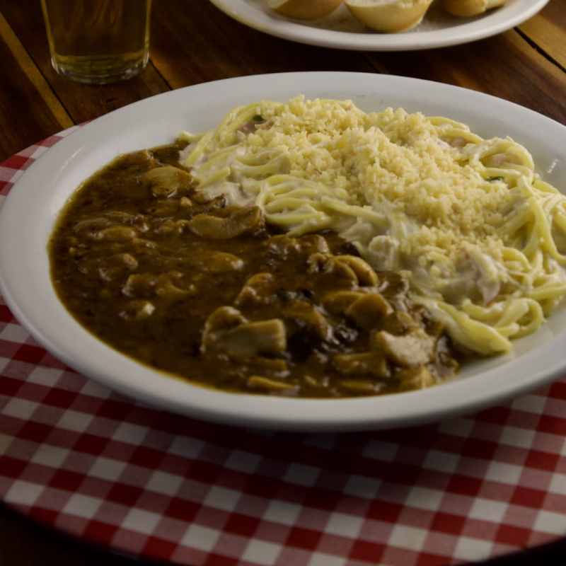 Fettuccine ao molho de requeijão com frango desfiado e presunto, acompanhado de filé mignon ao molho madeira c/ champignons.