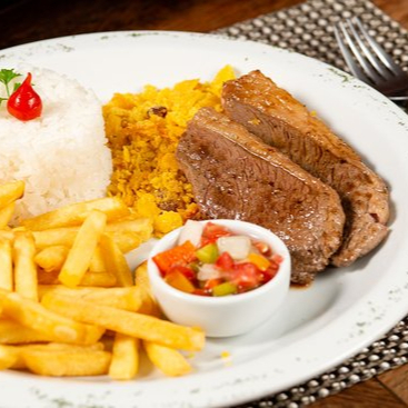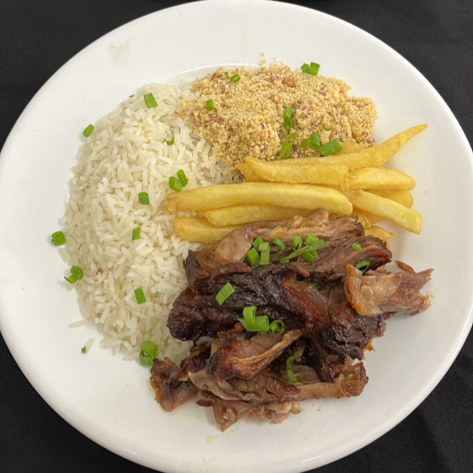 150g de picanha, arroz, farofa, fritas e vinagrete