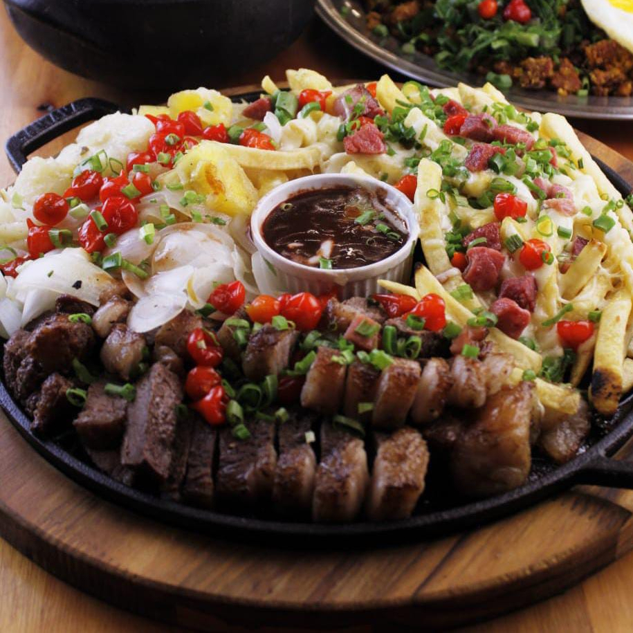 400g de picanha argentina feita na brasa, acompanhada de 400g de fritas c/ mussarela e bacon, 400g de mandioca na manteiga e cebola assada e finalizada com cheiro verde e pimenta biquinho. Acompanha feijão tropeiro, arroz c/ alho e vinagrete. Serve 4 pessoas