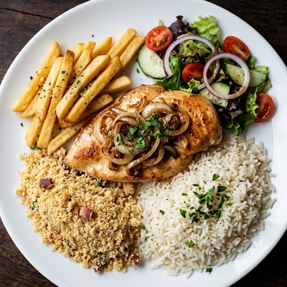 Arroz, bife de frango acebolado, fritas e salada