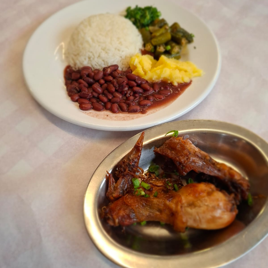 Frango caipira, arroz, feijão, angu, couve e quiabo