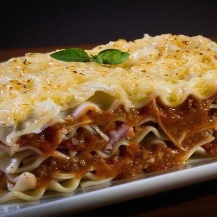Lasanha à bolonhesa finalizada com molho branco e queijo gratinado. Serve 2 pessoas
