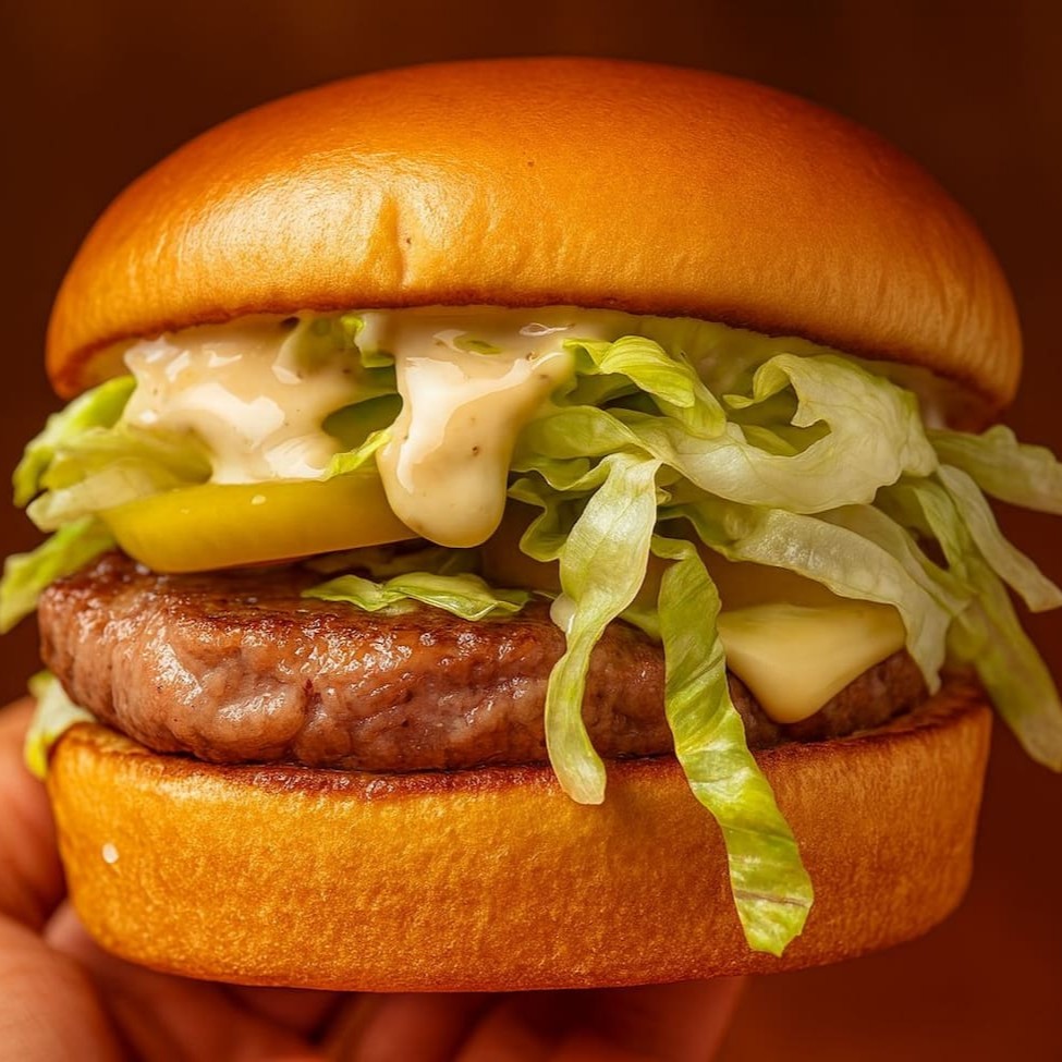 Pão brioche macio envolve 150g de blend bovino suculento, maionese grill e alface com tomate fresquinho. Cada mordida revela sabor intenso e equilíbrio perfeito.