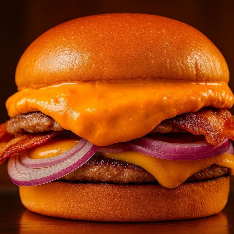 Pão brioche, dois hambúrgueres de 90g suculentos de boi, cheddar derretido, bacon crocante e cebola roxa . Uma explosão de sabores a cada mordida!