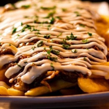 Batata palito crocante com carne suína temperada, Catupiry cremoso e toque de cebolinha fresca.