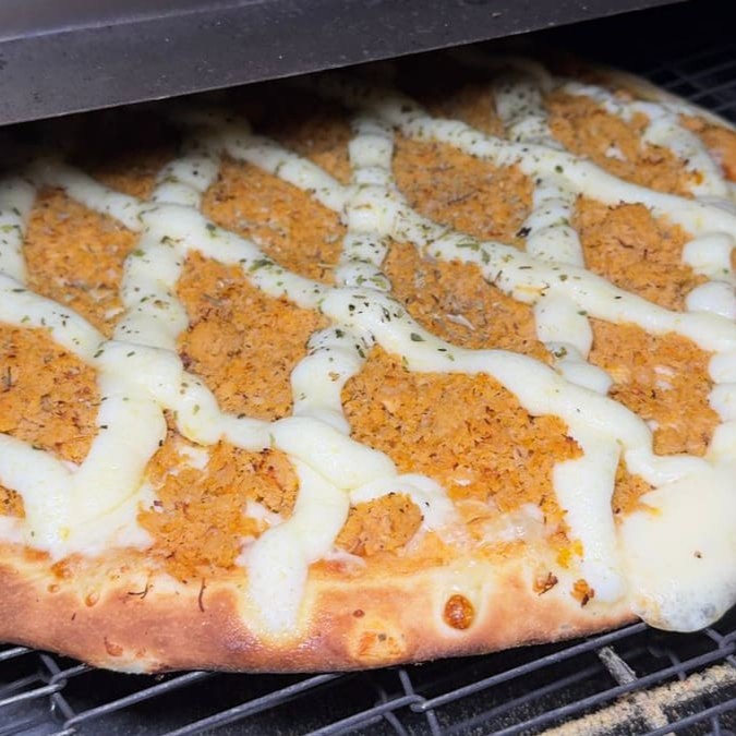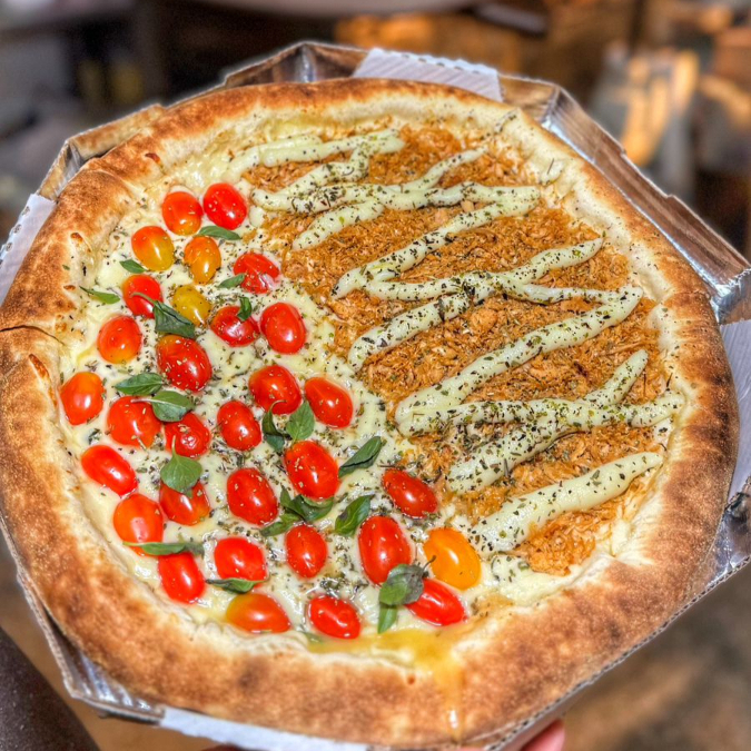 Massa, molho sugo, 200g muçarela, queijo prato, parmesão e oregano