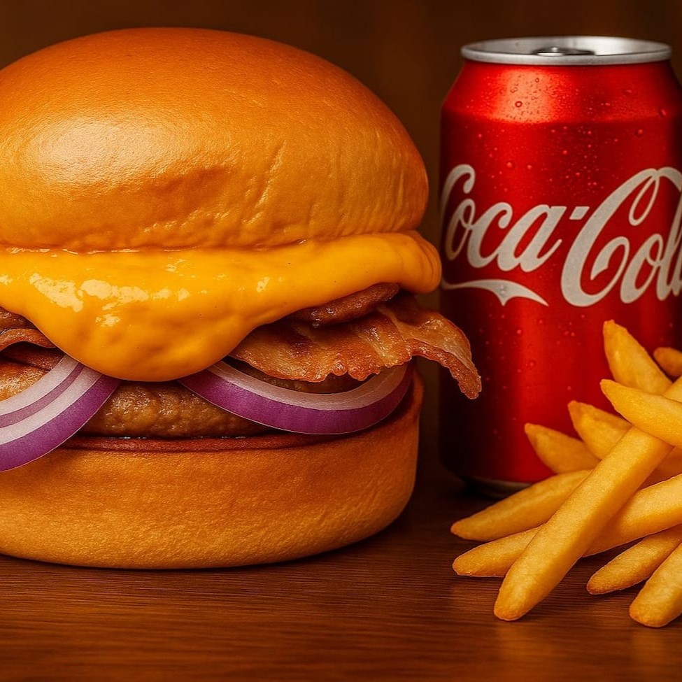 Hambúrguer com duas carnes de 90g, cheddar cremoso, bacon crocante, cebola roxa e pão brioche. Acompanha uma batata frita crocante + 1 refrigerante lata gelado. Sabor de respeito do início ao fim!