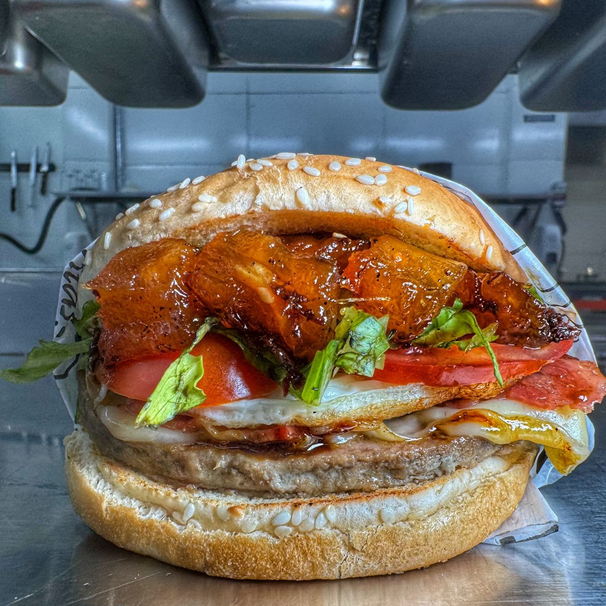 Pão brioche, um hambúrguer de 90g suculento de boi, bacon crocante, abacaxi caramelizado e camadas de muçarela, alface e tomate fresquinho.