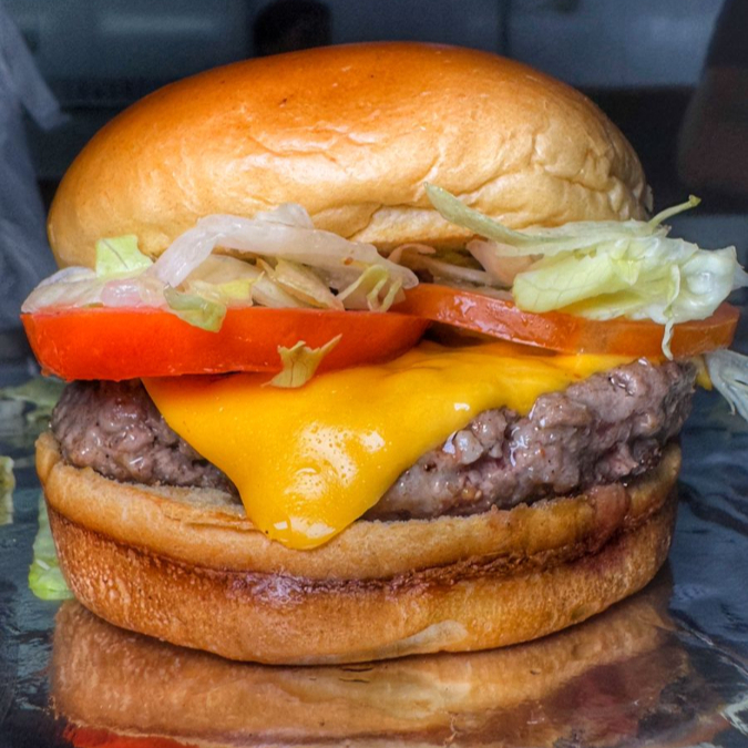 Pão brioche dourado na chapa , recheado com blend bovino suculento de 150g, queijo cheddar derretido, alface crocante e fatias de tomate fresco.