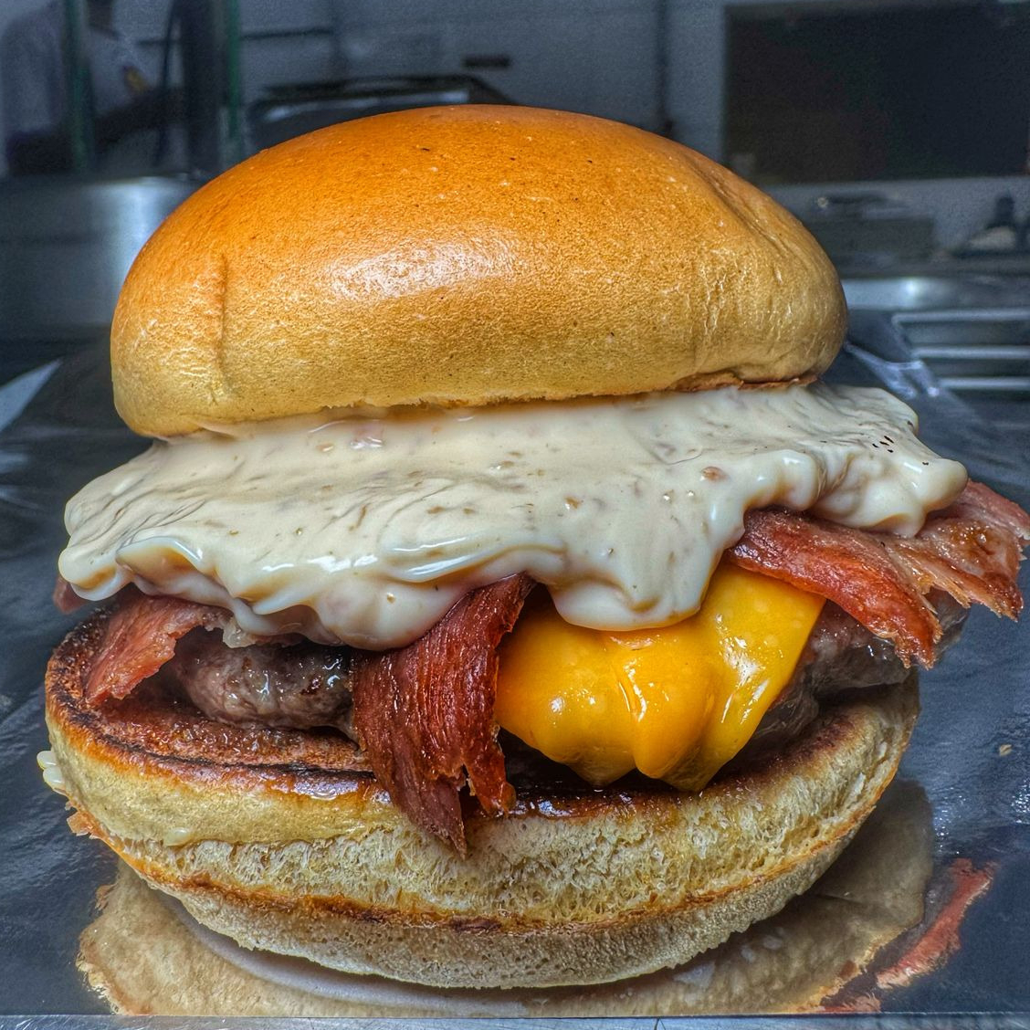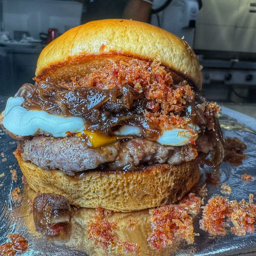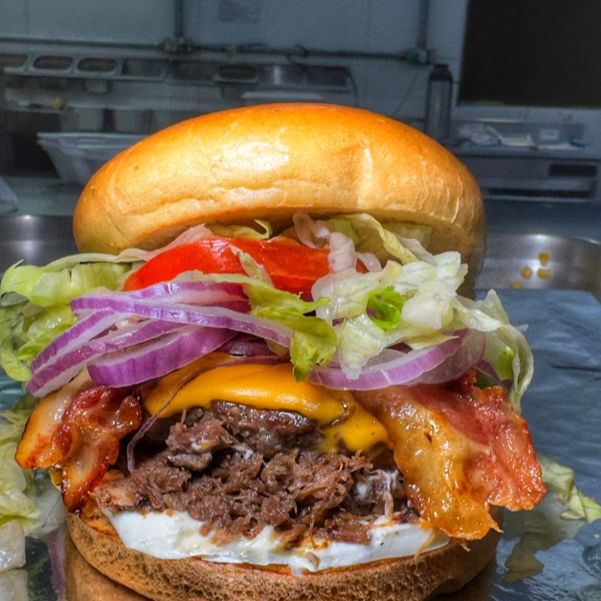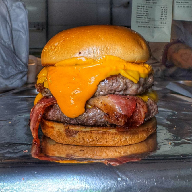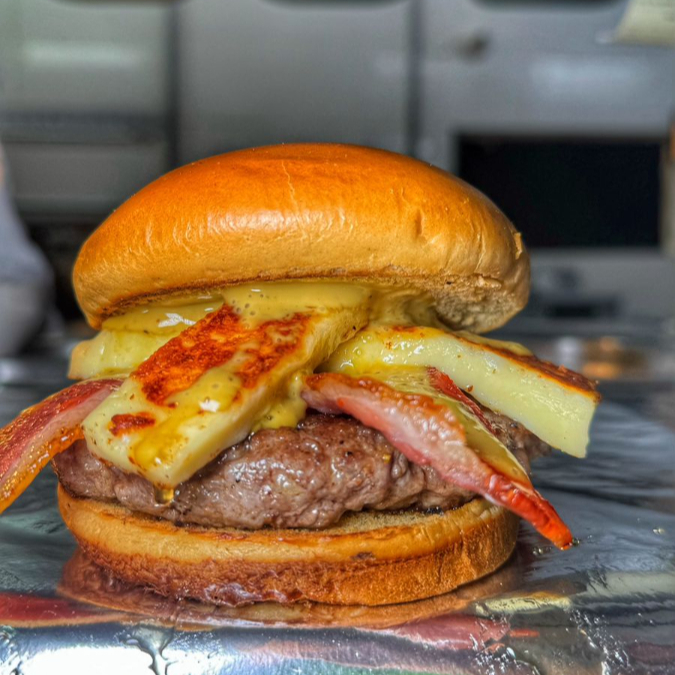 Pão brioche dourado na chapa , recheado com carne bovina suculenta 1250g , fatias de bacon crocante, muçarela derretida e um toque de doce de leite que transforma cada mordida em uma explosão de sabores.