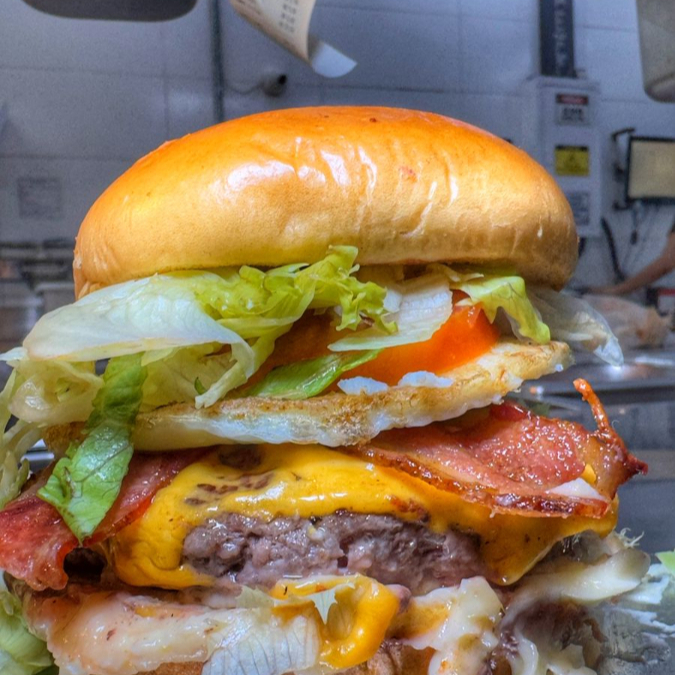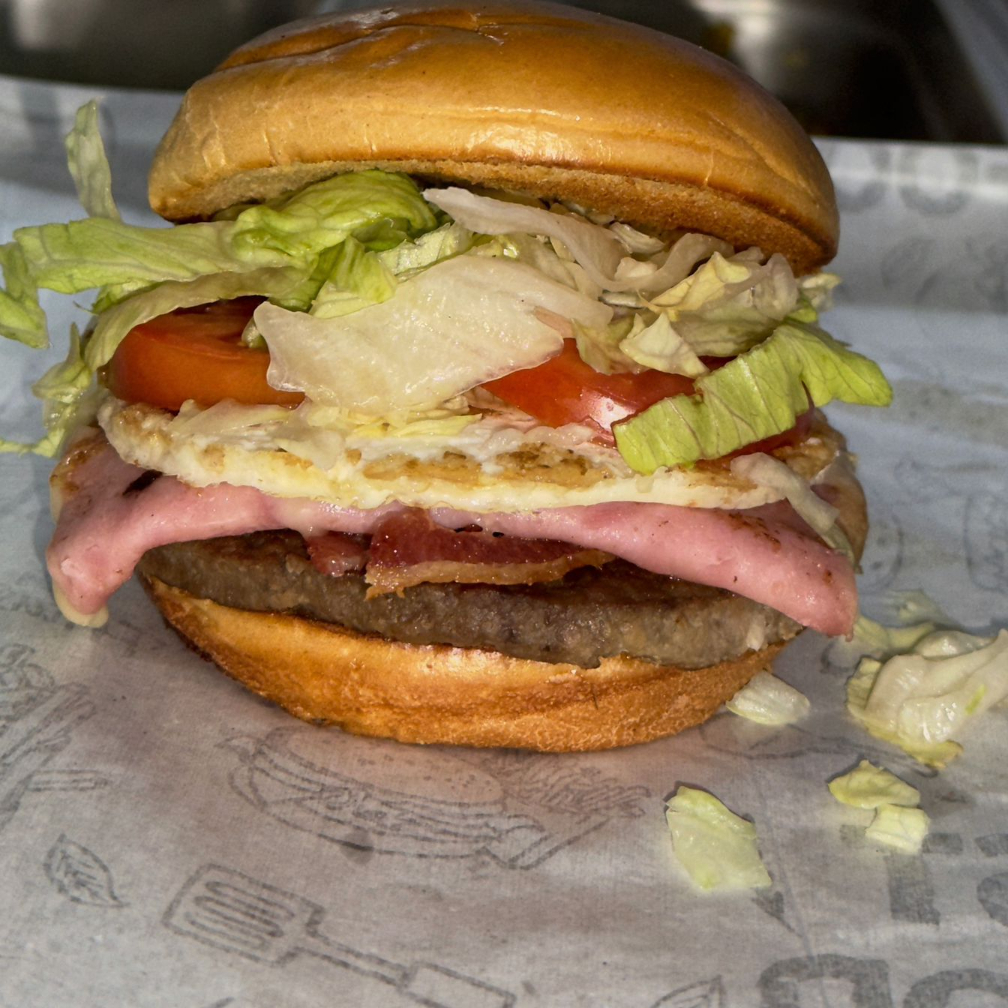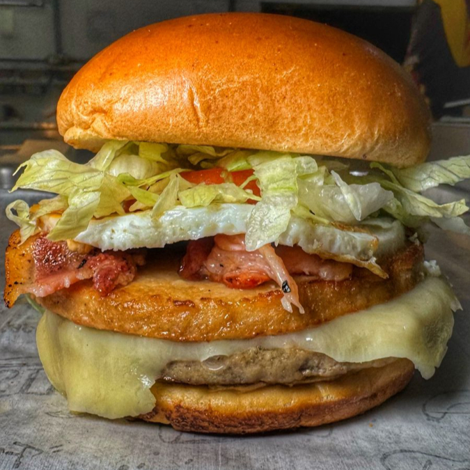 Pão brioche, hambúrguer suculento de 90g, ovo frito, bacon crocante, queijo derretido e presunto fresco, finalizado com uma salada fresca.