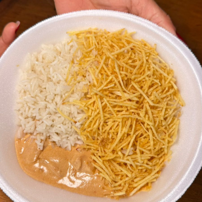 Estrogonofe de frango cremoso , servido com arroz e batata palha crocante.