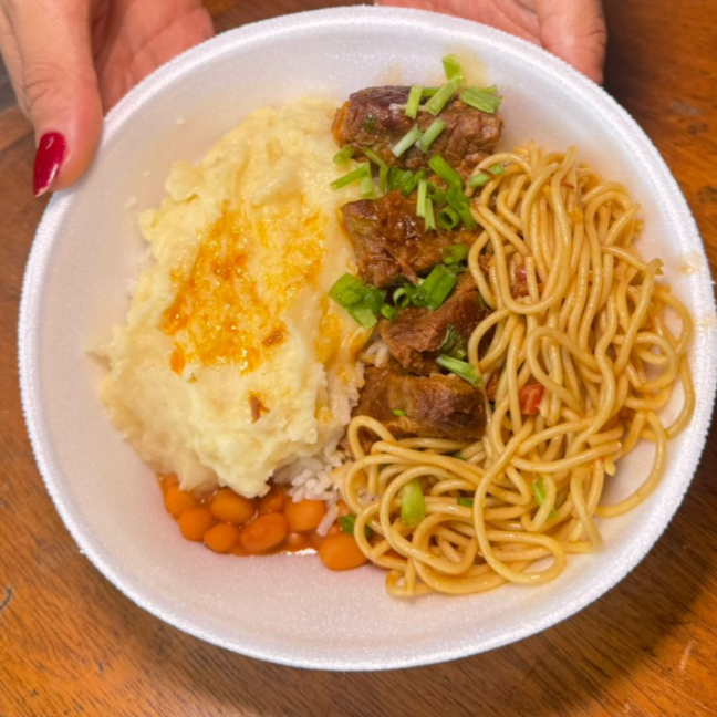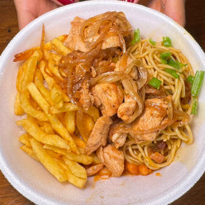 Arroz branco soltinho, feijão caseiro, batata frita crocante e macarrão alho, óleo e bacon.