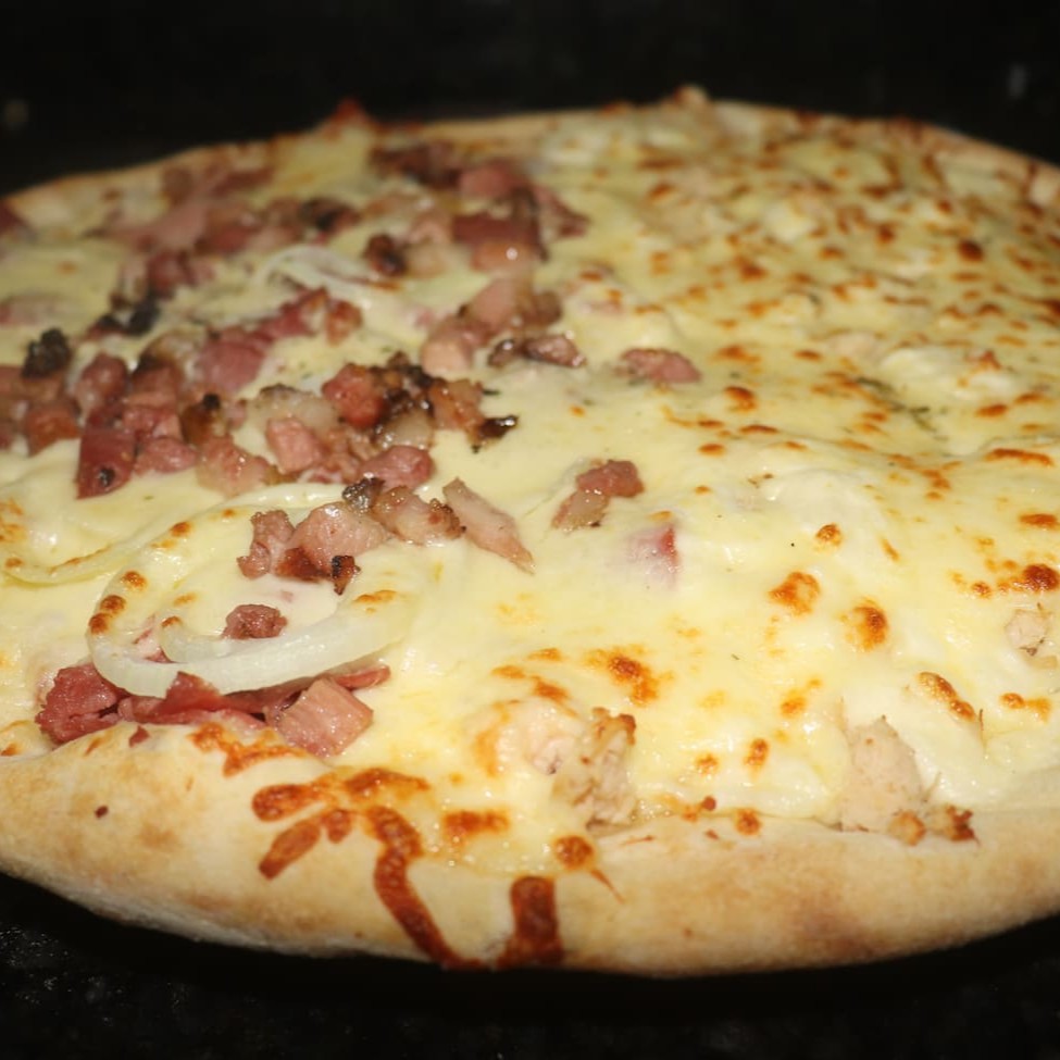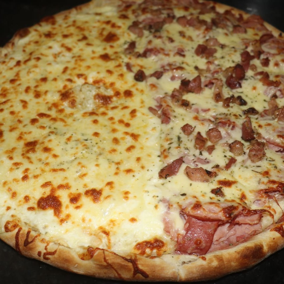Bacon de um lado, Catupiry do outro? Já pensou? Com muita calabresa, bacon, cebola e mussarela de um lado e mussarela, frango Catupiry do outro lado.