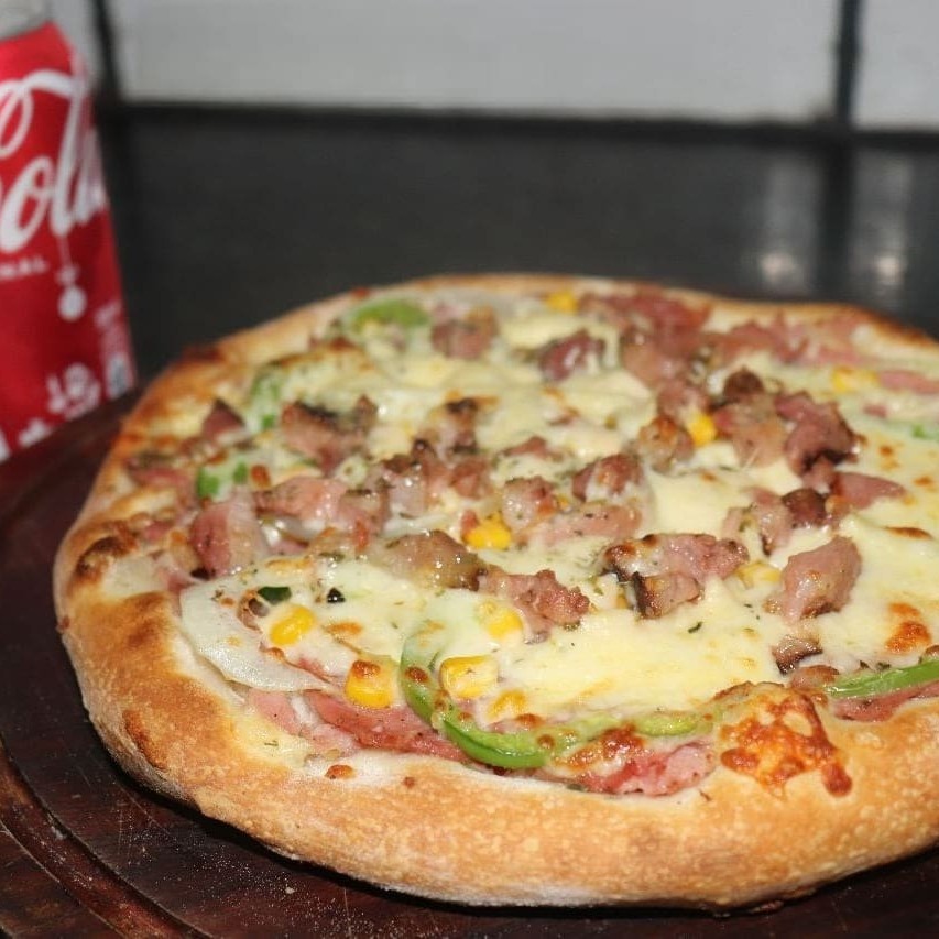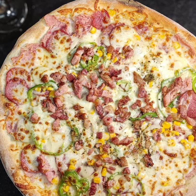 A queridinha dos nossos clientes passando na sua telinha. Com a massa fresca, aberta na hora, mussarela selecionada, presunto, calabresa defumada, milho, bacon, pimentão, cebola e orégano. Atenção: Pizza grande de 30 cm - 8 fatias. Caso deseje um tamanho maior é só escolher abaixo.