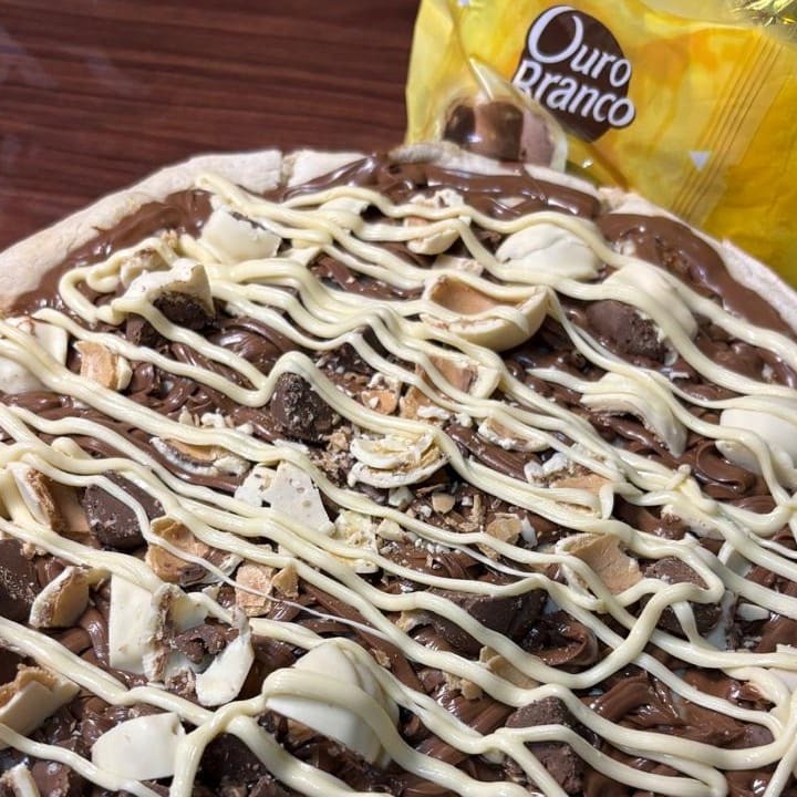 Uma pizza com sabor inigualável, com chocolate Ouro Branco deixando tudo perfeito. Nutella, Ouro Branco e Ninho!